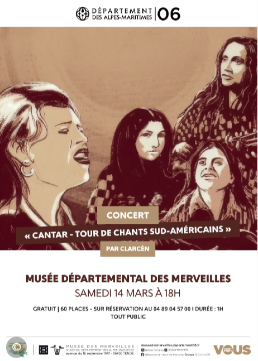 Le samedi 14 mars, de 18h00 à 19h00, le Musée départemental des Merveilles accueille le concert « Cantar – Tour de chants sud-américains », présenté par Clarcèn, en collaboration avec l’association Poisson d’herbe.