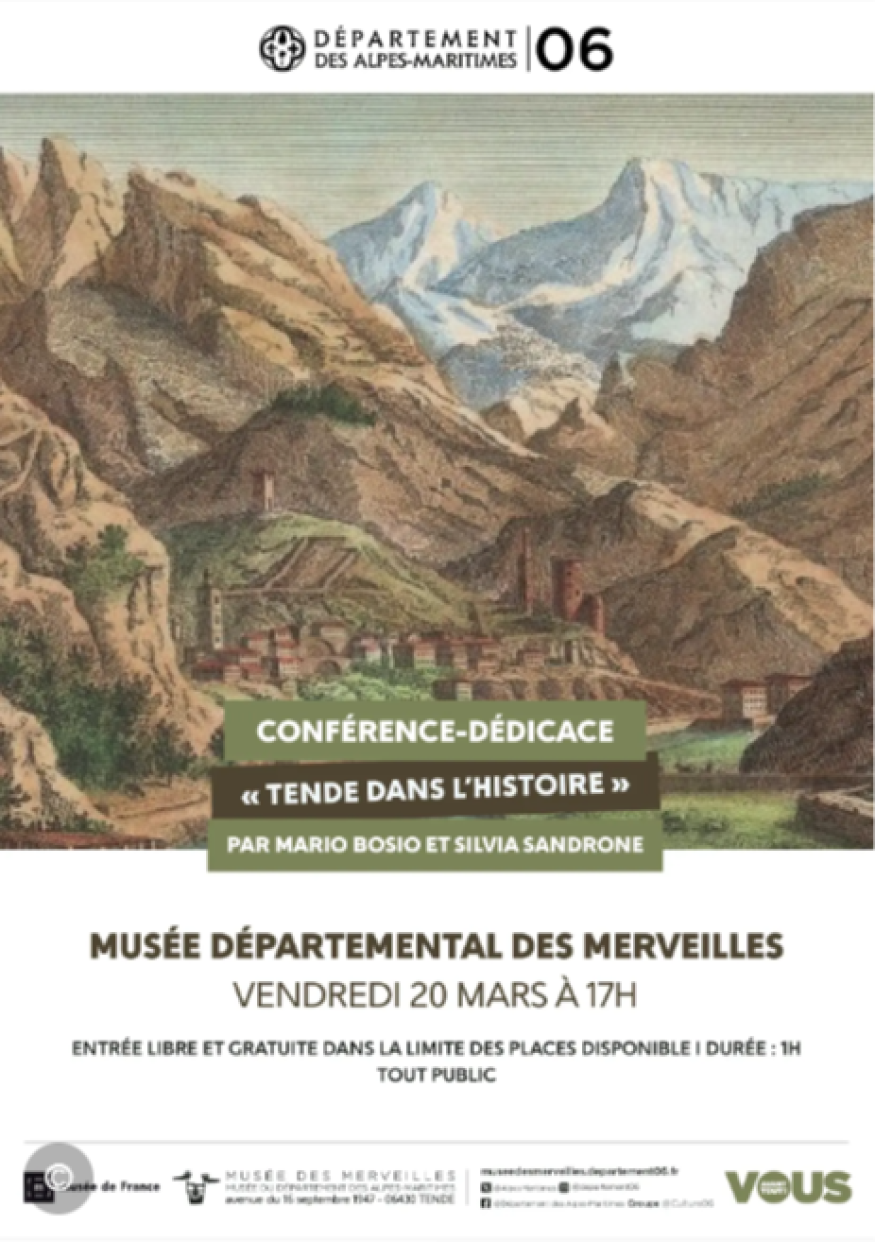 Vendredi 20 mars, de 17h à 18h, le Musée départemental des Merveilles accueille une conférence-dédicace intitulée « Tende dans l’histoire ». Protégée au nord par les contreforts des Alpes méridionales et au sud par de profondes gorges rocheuses, Tende semble n’être qu’un simple point sur la carte. Pourtant, sa position stratégique a longtemps facilité le passage des personnes et des marchandises entre la côte franco-ligure et la vallée du Pô. Au fil des siècles, l’histoire de ce petit village se mêle étroitement à celle de l’Europe occidentale. Présenté par l’un de ses fils, grand passionné d’histoire, ce récit à la fois savant et accessible met en lumière la richesse historique de Tende, lui conférant une valeur à la fois locale et universelle. La participation est limitée au nombre de places disponibles