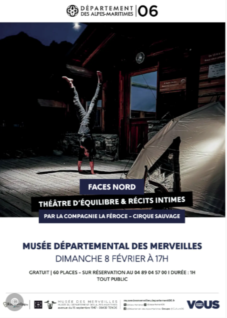 Le dimanche 8 février, de 17h à 18h, le Musée départemental des Merveilles accueille Faces Nord, une création de théâtre d’équilibre et de récits intimes proposée par la Compagnie La Féroce. Nourri de récits, de fragments de conversations, de chants et d’images, le spectacle façonne un univers à la fois sonore et plastique. Les artistes y interrogent leur lien profond avec la montagne, ce lieu à la fois fascinant et hostile : qu’y trouve-t-on d’extraordinaire, quelles histoires personnelles nous y rattachent, et qu’est-ce qui nous pousse à chercher toujours plus de distance entre la terre et les sommets ?Réservation conseillée au 04 89 04 57 00.