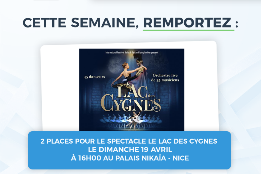 [JEU CONCOURS FACEBOOK - RADIO VALLEE RIVIERA] Du 30/03/2026 au 03/04/2026, tentez de gagner 2 places pour le spectacle Le Lac Des Cygnes le 19 avril au palais Nikaia ! Pour participer : "Aimez" cette publication et "identifiez 5 amis" en commentaire. "Abonnez vous" à notre page. Répondez à la question : Dans ce spectacle combien de danseurs et combien de musiciens seront sur scène ? 1) 3 danseurs et 80 musiciens 2) 45 danseurs et 35 musiciens 3) 100 danseurs et 10 musiciens 2 places seront tiré au sort parmi les bonnes réponses et attribuées à 1 gagnant le 0...