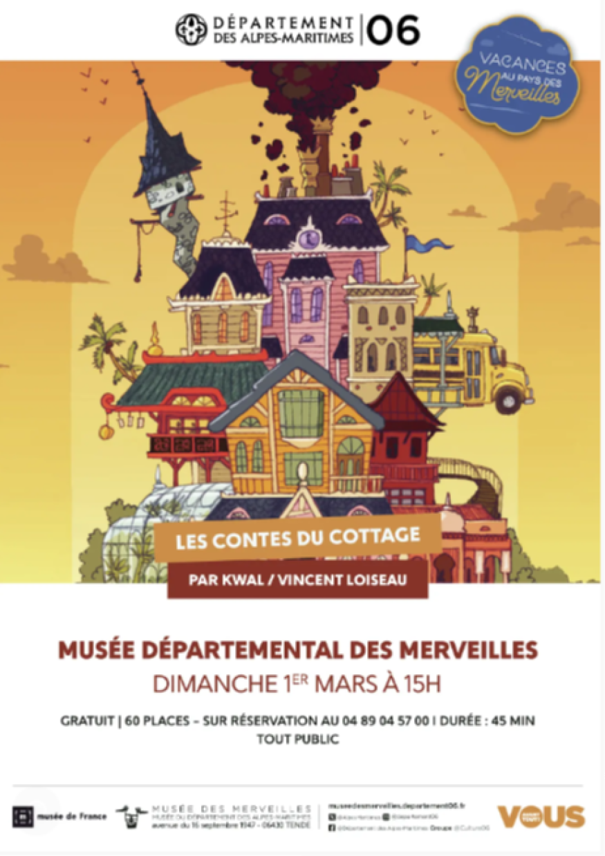 Dimanche 1er mars, de 15h à 15h45, le Musée départemental des Merveilles propose Les Contes du Cottage, une série de fables pétillantes, humoristiques et poétiques, écrites et racontées par Vincent Loiseau, dit Kwal.
