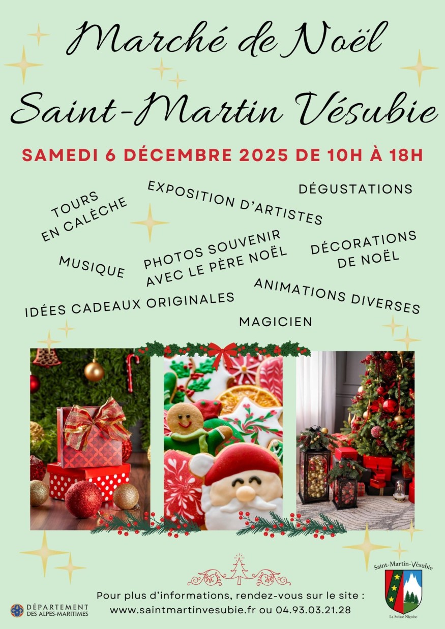 Le samedi 6 décembre 2025, de 10h à 18h, Saint-Martin-Vésubie vous invite à célébrer la magie des fêtes lors de son marché de Noël.Plongez dans une ambiance féérique et conviviale où artisans, créateurs et producteurs locaux vous proposeront une multitude d’idées de cadeaux, de dégustations gourmandes et de produits du terroir.