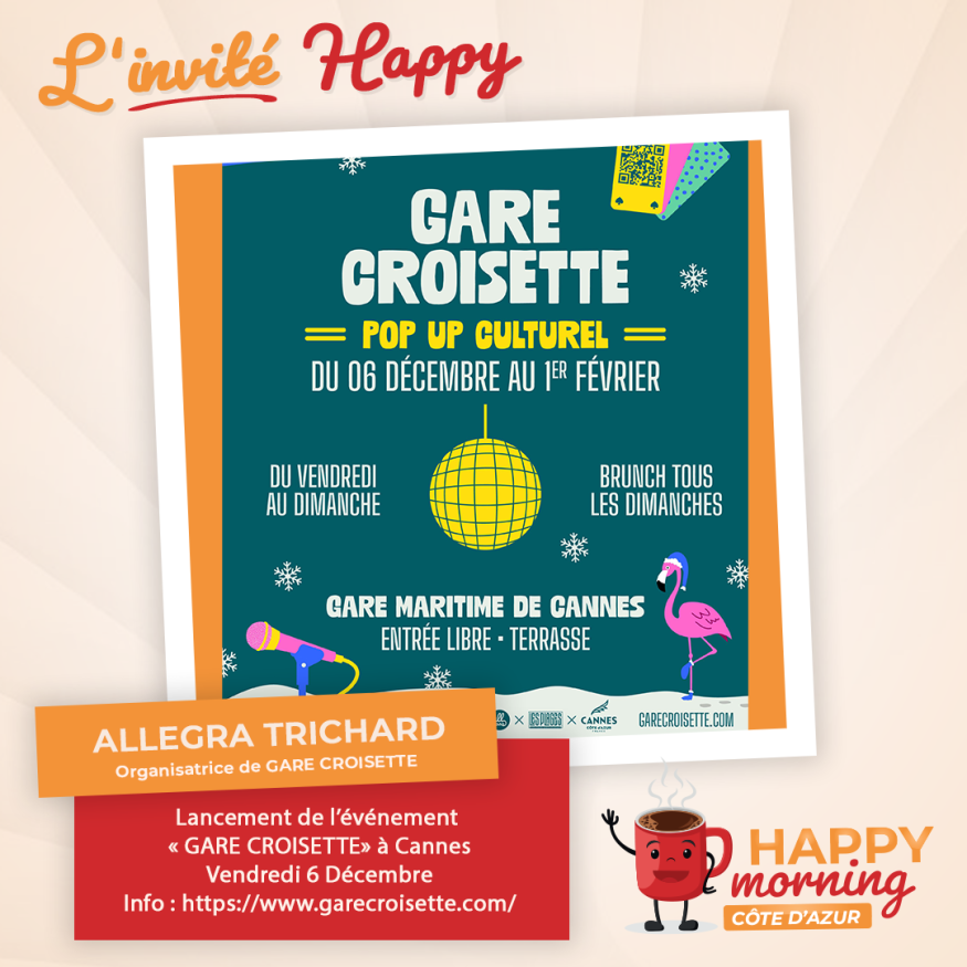 Dans l'émission happy morning Côte d'Azur, Loric reçoit Allegra Trichard Organisatrice de gare croisette. Présentation et questions / réponses sont au programme de cet interview.